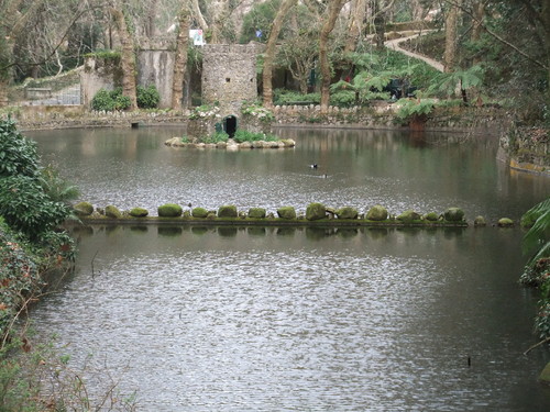 Podemos perder-nos nestes caminhos, pesquisando as várias espécies arbóreas e passeando por pontes e fontes até chegarmos, cá em baixo, ao Lagos, como este, que a foto documenta, com uma torre medieval que serve de casa para os patos.